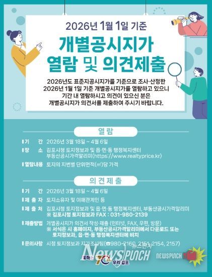 뉴스펀치 박상훈 기자 | 김포시는 2026년 1월 1일 기준 개별공시지가(안)에 대하여 오는 3월 18일부터 4월 6일까지 열람을 실시하고 토지소유자 및 이해관계인의 의견을 접수한다고 밝혔다.