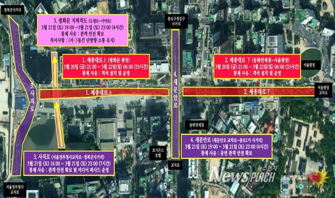 우선 경찰 등에 따라 광화문 주변은 행사 당일 도로 통제가 실시된다. 통제되는 주요도로 세종대로, 사직로, 새문안로 등이며 구간별 통제가 실시된다. 시는 원활한 행사가 이뤄질 수 있도록 경찰 도로 통제에 맞춰 교통불편 최소화를 위한 대중교통 운행 조치도 시행할 예정이다.