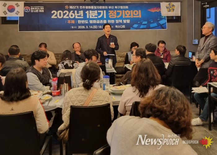 뉴스펀치 김윤걸 기자 | 민주평화통일자문회의 부산 북구협의회는 지난 14일 오후 6시 30분, 경남 통영에서 자문위원 31명이 참석한 가운데 ‘한반도 평화공존을 위한 대내외 정책 추진방향’을 주제로 ‘2026년 1분기 정기회의’를 개최했다.