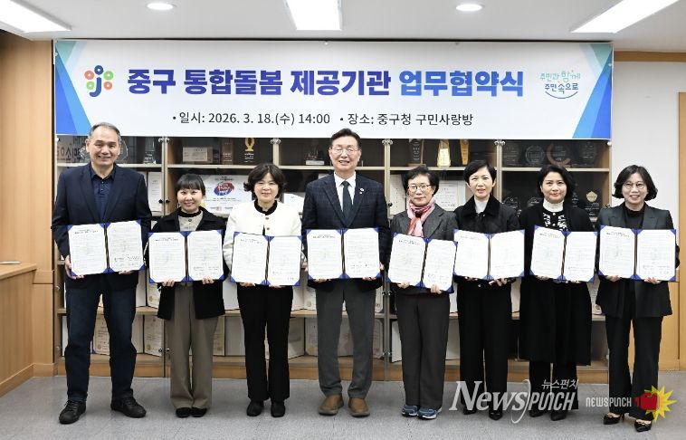 뉴스펀치 이현승 기자 | 대전 중구는 18일 통합돌봄 일상생활지원 서비스 제공기관 7개소와 ‘2026년 중구 통합돌봄사업 서비스 제공’을 위한 업무협약을 체결했다고 밝혔다.