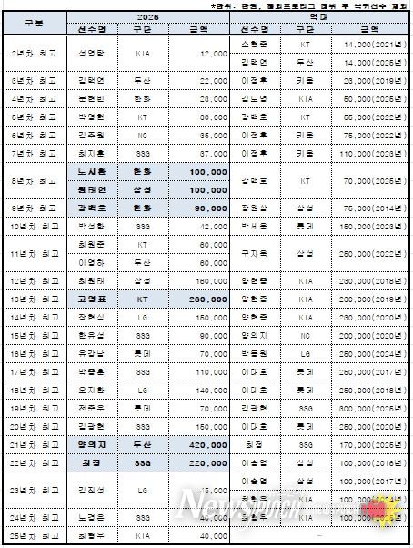 또한 2026시즌부터 시행되는 아시아쿼터 선수들의 연봉도 집계됐다. LG 웰스, SSG 타케다, 두산 타무라가 각각 20만 달러씩 받으며 아시아쿼터 선수 연봉(계약금 포함) 공동 1위에 올랐다.