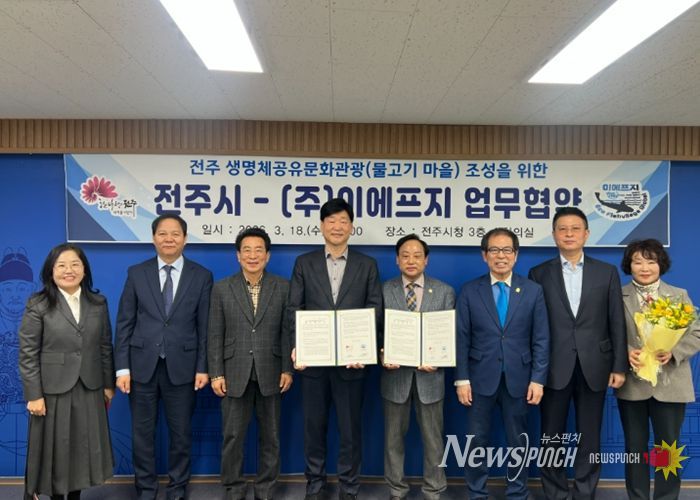 시는 18일 시청 3층 소회의실에서 윤동욱 전주 부시장과 류병덕 ㈜이에프지 대표 등이 참석한 가운데 ‘생명체 공유 문화관광(물고기마을)’ 사업 추진을 위한 업무협약을 체결했다.