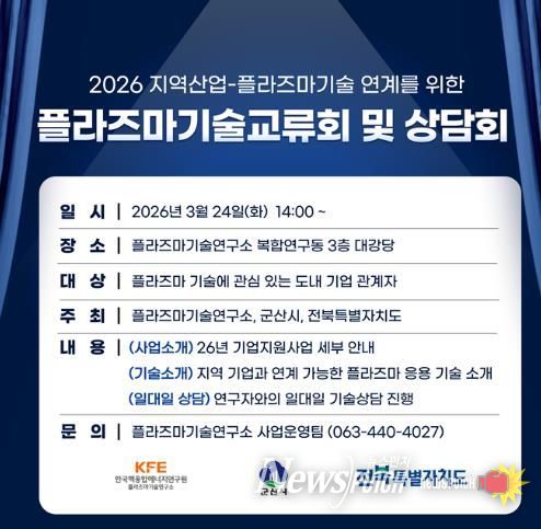뉴스펀치 정홍균 기자 | 군산시는 오는 24일 전문 연구기관인 플라즈마기술연구소에서 도내 기업을 대상으로 ‘지역산업-플라즈마 기술 연계를 위한 기술교류회 및 상담회’를 개최한다고 18일 밝혔다.