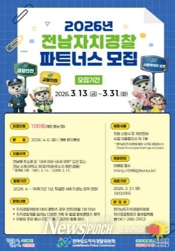 뉴스펀치 김용희 기자 | 전라남도자치경찰위원회는 도민과의 소통을 강화하고 현장 중심 자치경찰 치안 활동을 함께할 ‘2026년 전남자치경찰 파트너스’를 31일까지 모집한다고 밝혔다.