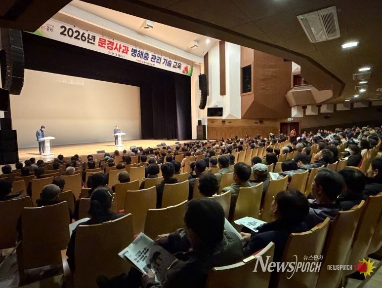 뉴스펀치 박세훈 기자 | 문경시농업기술센터는 3월 18일 문화예술회관 대공연장에서 2026년 문경사과 병해충 관리 기술 교육을 추진했다.