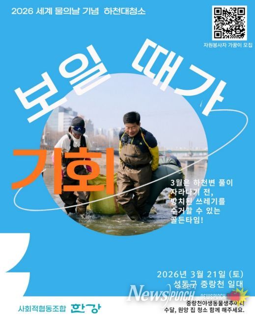 뉴스펀치 박상훈 기자 | 서울 성동구와 사회적협동조합 한강은 세계 물의 날(3월 22일)을 맞아 오는 3월 21일 오전 10시부터 오후 1시까지 성동구 중랑천 일대에서 하천 대청소 자원봉사 활동을 진행한다고 밝혔다.