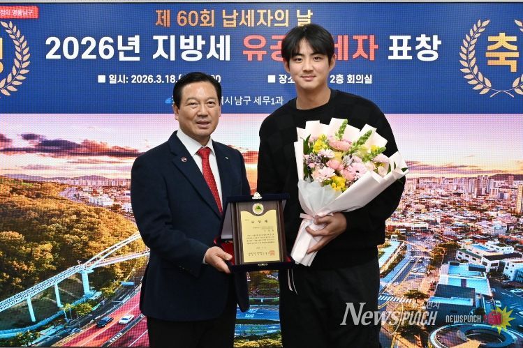 뉴스펀치 조평훈 기자 | 대구 남구는 지난 18일 제60회 납세자의 날을 맞아 지방세를 성실히 납부해 지역발전에 기여한 유공 납세자 구자욱(야구선수, 삼성라이온즈)에게 대구광역시장 표창패를 수여했다.