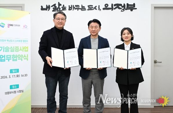 뉴스펀치 박상훈 기자 | 의정부시는 3월 17일 시청 시장실에서 지역 스타트업 ㈜강단스튜디오, 경기콘텐츠진흥원과 기술실증(PoC) 사업 업무협약을 체결하고, 스타트업 지원과 공공 혁신을 위한 협력 체계 구축에 나섰다.