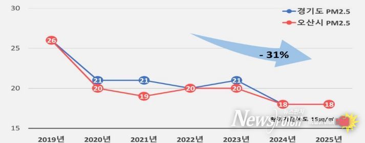 시에 따르면 오산시의 초미세먼지 연평균 농도는 2019년 이후 경기도 평균 수준을 유지하고 있으며, 보다 쾌적한 대기환경 조성을 위해 지속적인 관리와 개선 노력을 이어가고 있다. 시는 2026년 초미세먼지 연평균 농도 17㎍/㎥ 달성을 목표로 총력을 기울일 방침이다.