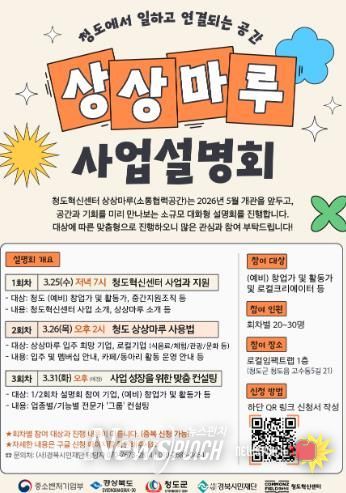 청도군 관계자는 “상상마루는 청도에서 일하고 연결되는 새로운 공동체 삶을 지향하는 곳으로 이번 사업 설명회를 통해 지역의 창의적인 인재들과 활동가들이 모여 청도의 미래를 함께 그려나가는 기회가 되기를 바란다”고 전했다.