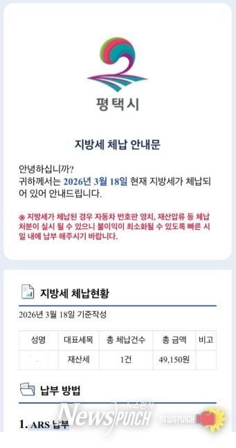 뉴스펀치 박상훈 기자 | 평택시는 ‘모바일 전자고지 시스템’을 활용해 지방세 체납자 1만7천여 명을 대상으로 오는 23일과 24일 이틀 동안 전자문서 형태의 체납안내문을 발송할 예정이다.