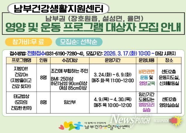 이번 프로그램은 다양한 계층을 대상으로 비만 예방·관리를 지원하는 ‘지방Off 건강On(지방 줄이고 건강 찾자!)’교실과 임산부의 영양 관리를 돕는 ‘태교밥상(모자의 건강한 한 끼)’교실 프로그램을 구성해 2026년 3월 17일부터 신청을 받고 있다.