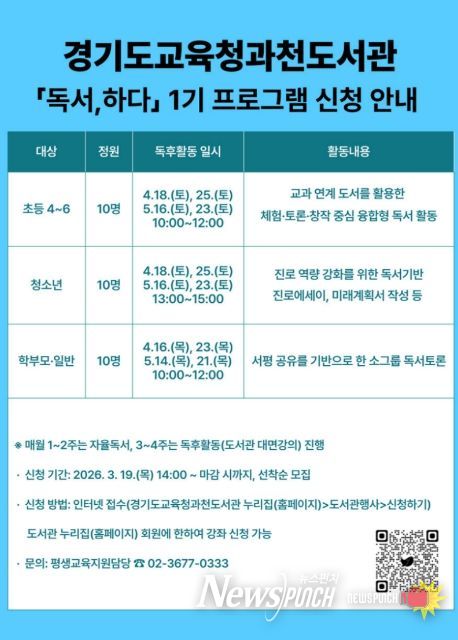 뉴스펀치 박상훈 기자 | 경기도교육청과천도서관이 지역주민의 독서 역량 강화와 융합적 사고력 함양을 위해 '2026년 독서, 하다’프로그램을 운영한다.