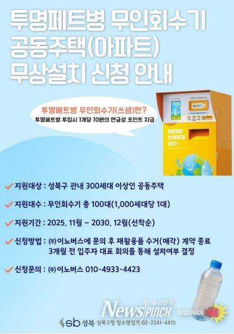 또 지난해 성북구는 11월 무인회수기 운영업체와 협약을 체결하고, 관내 300세대 이상 공동주택을 대상으로 무인회수기 무상 설치 지원 사업을 추진 중이다. 해당 사업은 2030년까지 진행되며, 올바른 분리배출 문화 정착을 위한 홍보와 지원을 이어갈 계획이라고 밝혔다.