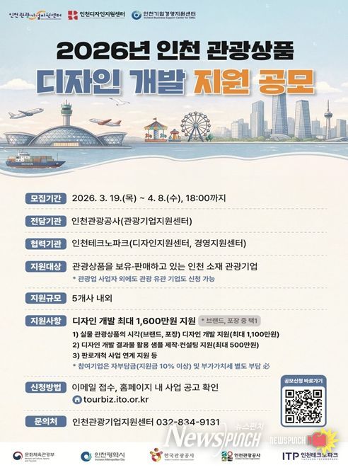 뉴스펀치 조평훈 기자 | 인천광역시와 인천관광공사는 지역 관광상품의 시장 경쟁력을 강화하고 브랜드 가치를 높이기 위해 '2026년 인천 관광상품 디자인 개발 지원 사업'에 참여할 역량 있는 기업을 오는 4월 8일까지 모집한다고 밝혔다.