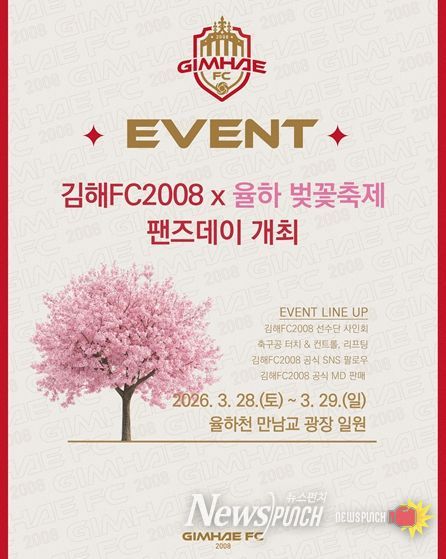 뉴스펀치 박세훈 기자 | 김해FC2008이 오는 28일 ‘제7회 율하 벚꽃축제’ 현장에서 팬들과 직접 소통하는 ‘팬즈데이’를 개최한다고 밝혔다.