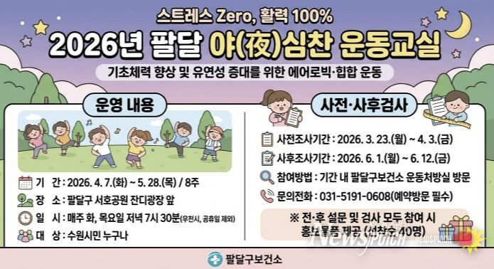 뉴스펀치 박상훈 기자 | 수원시 팔달구보건소가 시민들의 건강 생활 실천을 돕고 비만율을 낮추는 프로그램 ‘2026년 팔달 야(夜)심찬 운동교실’을 운영한다.