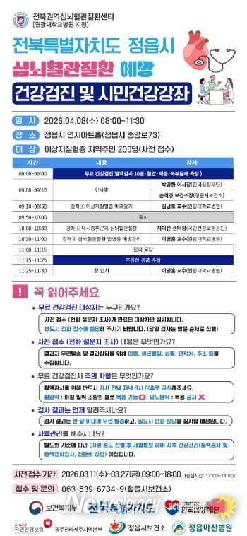 뉴스펀치 최영남 기자 | 정읍시 보건소가 지역 내 심뇌혈관질환 고위험군의 조기 발견과 체계적인 건강 관리를 돕기 위해 오는 27일까지 ‘심뇌혈관질환 예방 건강검진 및 시민건강강좌’ 참여자 200명을 선착순으로 모집한다.