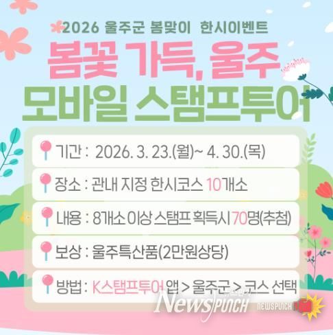 올해 새롭게 리뉴얼된 K스탬프투어 모바일 앱을 이용한 ‘봄꽃 가득, 울주’ 이벤트와 ‘울주와봄’ SNS 여행후기 인증 이벤트 등으로 구성됐다.
