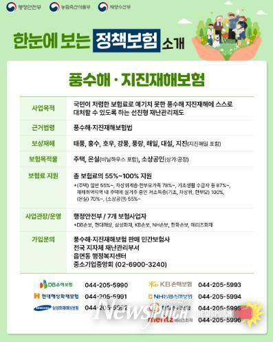 풍수해‧지진 재해보험은 행정안전부가 관장하고 민영 보험사가 운영하는 정책보험으로, 보험료의 일부를 국가와 지자체가 보조함으로써 적은 비용으로 자연재난 피해에 대비할 수 있는 재난 관리제도이다.