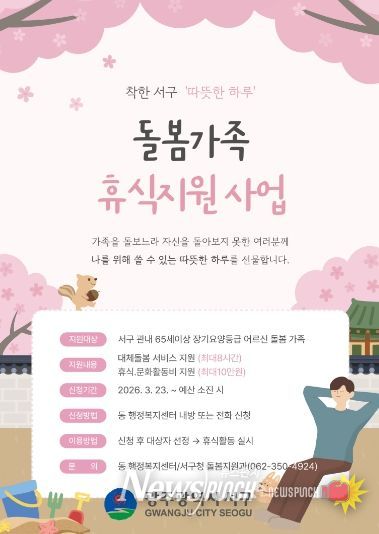 뉴스펀치 김용희 기자 | 광주광역시 서구가 광주 최초로 돌봄 가족에게 휴식 활동비를 지원한다. 서구는 장기간 가족을 돌보는 주민의 부담을 줄이고 지속 가능한 돌봄환경을 조성하기 위해 ‘돌봄가족 휴식지원사업’을 추진한다고 20일 밝혔다.