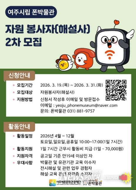 한편, 여주시립 폰박물관은 이번 해설사 모집 외에도 매월 주말 가족체험 프로그램 운영 등 관람객과의 소통을 위한 다양한 교육 콘텐츠를 지속적으로 기획·운영하고 있다.