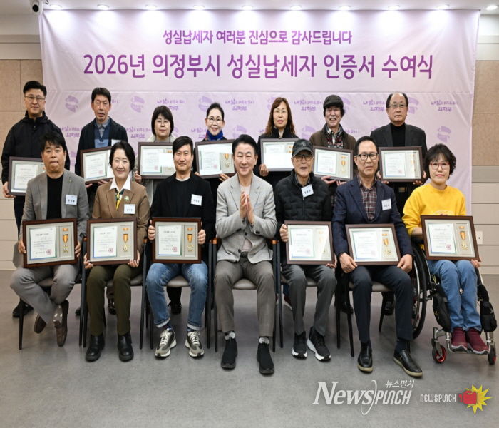 뉴스펀치 박상훈 기자 | 의정부시는 3월 19일 시청 회룡홀에서 ‘2026년 의정부시 성실납세자 인증서 수여식’을 개최했다.