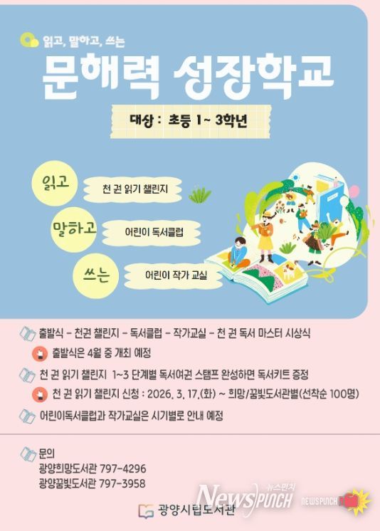 뉴스펀치 김용희 기자 | 광양시는 어린이들의 기초학습 역량인 문해력을 높이기 위해 4월부터 광양희망도서관과 광양꿈빛도서관에서 ‘문해력 성장학교’를 운영한다.
