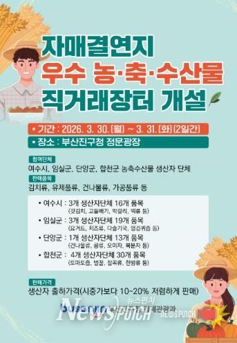 뉴스펀치 김윤걸 기자 | 부산진구는 3월 30일부터 31일까지 부산진구 정문광장에서 ‘자매결연지 농축수산물 직거래장터’를 개최한다고 밝혔다.