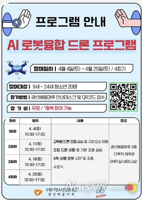 뉴스펀치 박상훈 기자 | 수원시청소년청년재단 권선배움마루는 오는 4월 청소년을 대상으로 AI 로봇융합 드론 프로그램을 운영할 계획이다. 이번 프로그램은 이론과 실습을 병행한 교육으로 구성되어 미래기술에 대한 이해를 높이고 디지털 역량을 강화하는 데 목적이 있다.