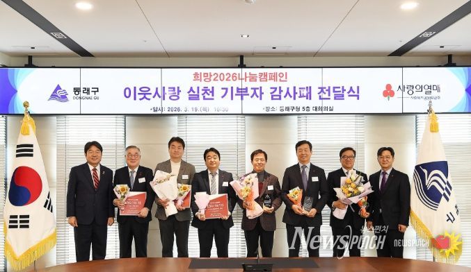 뉴스펀치 김윤걸 기자 | 부산 동래구는 지난 19일 부산사회복지공동모금회(회장 이수태) 주관으로 희망 2026 나눔 캠페인 이웃사랑 실천 기부자 감사패 전달식을 개최하고, 지역사회 나눔 문화 확산에 기여한 기부자들에게 감사의 뜻을 전했다고 밝혔다.