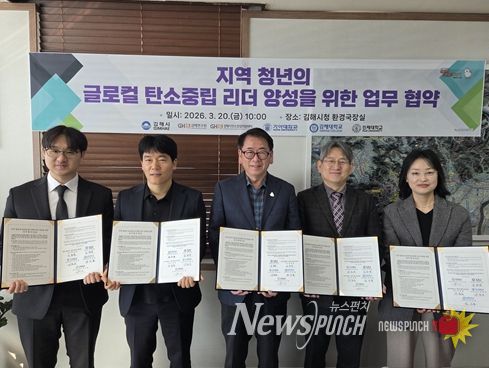 뉴스펀치 박세훈 기자 | 김해시는 20일 시청 환경국장실에서 김해연구원(김해시 탄소중립지원센터), 가야대학교, 김해대학교, 인제대학교와 함께 ‘지역 청년의 글로컬 탄소중립 리더 양성을 위한 업무협약’을 체결했다.