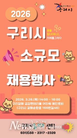 뉴스펀치 박상훈 기자 | 구리시는 오는 3월 26일 오후 2시부터 4시까지 갈매동 금강펜테리움IX 타워 로비에서 구리시 일자리센터 주관으로 소규모 채용 행사를 개최한다고 20일 밝혔다.