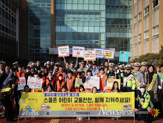 뉴스펀치 이현승 기자 | 천안동남경찰서는, 2026. 3. 20. 08:00경 천안시 동남구 삼룡동 소재 천안삼거리초등학교에서 어린이보호구역 내 교통사고 예방 및 안전한 등하굣길 조성을 추진하고자 민·관·경 합동으로 교통안전캠페인을 실시 했다.