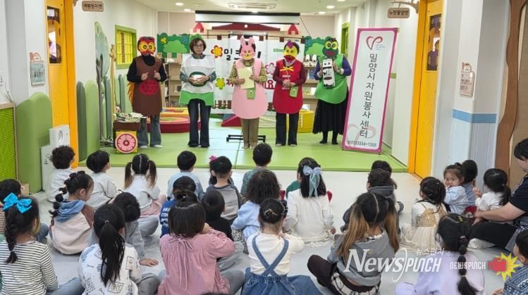 뉴스펀치 박세훈 기자 | 밀양여성리더봉사회는 20일 예임통통어린이집을 방문해 어린이들을 위한 환경교육 인형극 ‘밀크맨, 지구를 지켜주세요’를 선보였다.