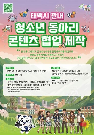 뉴스펀치 조평훈 기자 | 태백시는 청소년의 자발적인 참여를 통해 지역의 다양한 매력을 홍보하고, 미디어 제작 경험을 확대하기 위해 ‘청소년 동아리 콘텐츠 협업 제작 사업’을 연중 추진한다.