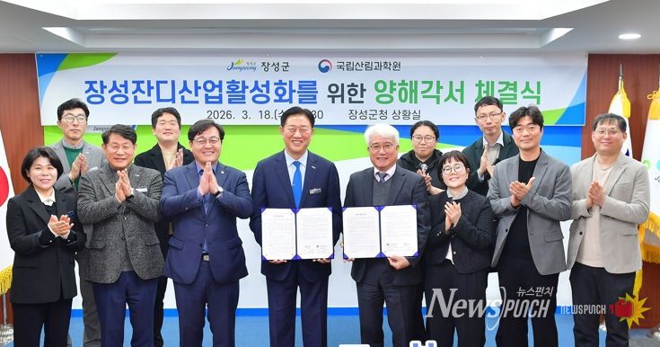 뉴스펀치 김용희 기자 | 장성군과 국립산림과학원이 18일 군청 상황실에서 잔디산업 활성화를 위한 업무협약을 체결했다. 협약식에는 김한종 장성군수, 권순덕 국립산림과학원 산림바이오소재연구소연구소장 등 관계자 10여 명이 참석했다.