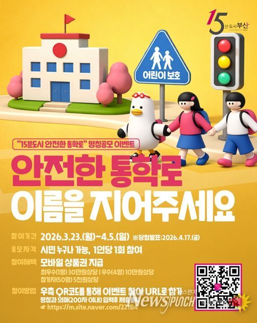 뉴스펀치 김윤걸 기자 | 부산시는 오늘(23일)부터 4월 5일까지 '15분도시 안전통학로 이름을 지어주세요'를 주제로 안전통학로 명칭 시민공모전을 개최한다고 밝혔다.