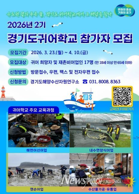 뉴스펀치 박상훈 기자 | 경기도해양수산자원연구소는 귀어 희망자의 어촌 정착을 지원하기 위해 4월 10일까지 ‘2026년 2기 귀어학교’ 교육 프로그램 참가자를 모집한다.