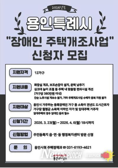 뉴스펀치 박상훈 기자 | 용인특례시는 지역 내 등록장애인을 대상으로 생활환경 개선을 위한 주거용 편의시설 설치 지원사업 신청을 4월 6일까지 받는다.
