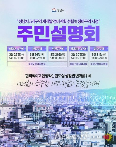 뉴스펀치 박상훈 기자 | 성남시는 수정·중원 생활권 재개발 후보지로 선정된 5개 구역의 정비계획 수립 및 정비구역 지정(안)과 관련해 주민 의견을 수렴하고자 오는 3월 25일부터 31일까지 주민설명회를 개최한다.