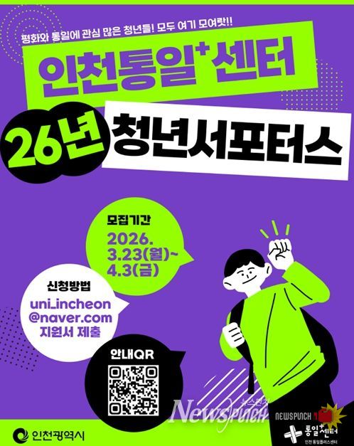 뉴스펀치 정홍균 기자 | 인천광역시는 청년 주도의 평화·통일 콘텐츠 제작과 확산을 위해 '2026년 인천통일+센터 청년서포터스'를 3월 23일부터 4월 3일까지 모집한다고 밝혔다.