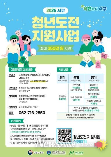 뉴스펀치 김용희 기자 | 광주광역시 서구는 고용노동부 주관 ‘2026년 청년도전지원사업’ 공모에 선정돼 예산 3억4천여만 원을 확보하고 구직 단념 청년 지원에 나선다.
