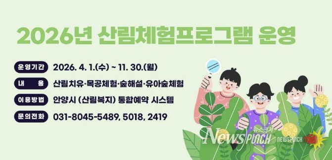 뉴스펀치 박상훈 기자 | 안양시는 4월부터 서울대 안양수목원을 비롯한 관내 수목원에서 ‘산림체험 프로그램’ 운영을 시작하며, 현재 통합예약시스템을 통해 사전 예약을 접수 중이라고 23일 밝혔다.