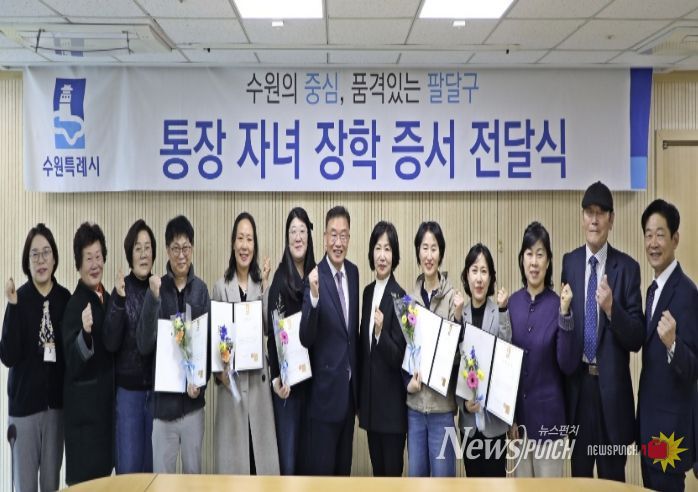 뉴스펀치 박상훈 기자 | 수원시 팔달구는 지난 20일 구청 상황실에서 지역 사회 발전을 위해 헌신하는 통장들의 사기 진작과 노고를 격려하기 위한 ‘2026년 상반기 통장 자녀 장학 증서 전달식’을 개최했다.