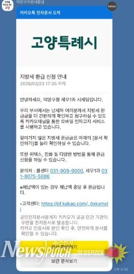 뉴스펀치 박상훈 기자 | 고양특례시 덕양구는 23일 오늘 지방세 환급금을 수령하지 않은 납세자를 대상으로 카카오 알림톡(채널명: 덕양구지방세환급)을 발송해 환급금 조회 및 신청 방법을 안내할 예정이다.