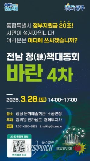 뉴스펀치 최영남 기자 | 전라남도는 오는 28일 오후 2시부터 장성 문화예술회관에서 전남 청책대동회 바란을 개최, 전남광주통합특별시 출범과 함께 정부가 약속한 20조 원의 재정 활용 방안을 시도민과 함께 논의할 예정이다.