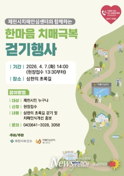뉴스펀치 이현승 기자 | 제천시는 오는 4월 7일 삼한의 초록길 일원에서 ‘한마음 치매극복 걷기 행사’를 개최한다고 밝혔다.