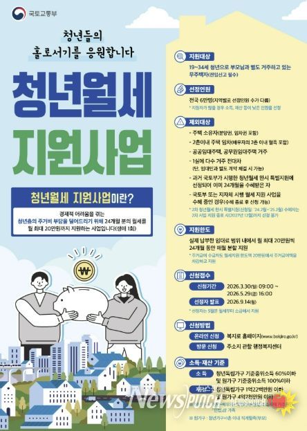 지원 대상은 만 19세부터 34세 이하의 청년으로, 부모와 별도로 거주하는 무주택자여야 하며 전입신고가 필수다. 지원 내용은 생애 1회 한해 실제 납부한 임대료 범위 내에서 월 최대 20만 원씩, 최대 24개월 동안 분할 지급된다.