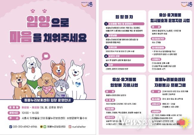 지난해 시흥시에 접수된 551마리의 유실‧유기 동물 중 절반 이상인 308마리가 입양‧기증됐다. 시는 건강한 입양 문화 활성화를 위해 유실‧유기 동물을 입양하는 반려가족에게 반려동물 진료비, 검진비 등 입양 후 필요한 최소한의 비용(15만 원 한도)을 지원함으로써 입양률을 높이고자 노력하고 있다. 국내 입양이 어려운 중‧대형견도 동물보호단체와 연계해 해외 입양을 지원한다.